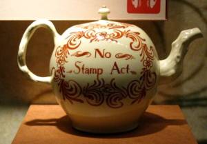 This particular vessel, protesting the Stamp Act, resides in the Dewitt Wallace Museum in Williamsburg, Virginia, where reproductions are also for sale. The Stamp Act, which preceded the Boston Tea Party by about eight years, was passed in 1765. The Act placed a tax on printed materials in the colonies, in order to raise money to pay the costs of the French and Indian War.