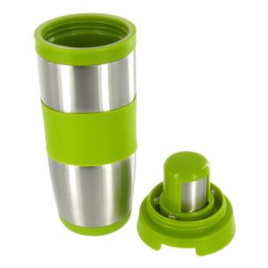 The Tea Thermal is sleek and modern in its design. The stainless steel mug is decked out in a leaf green plastic hand grip and a removable drinking spout that also houses the tea-steeping chamber. What makes this product unique in its design is the removable steeping chamber offers a “steep” and “stop” feature, all at the turn of a dial. This ingenious feature allows me to enjoy fresh-brewed tea without over-steeping!