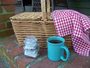 This will be a short four or five days’ stay with relatives, coffee-drinkers who have grown used to my persnickety tea ways. I will manage happily with tea bags–Taylors of Harrogate Afternoon Darjeeling and PG Tips for the pyramid tea bag style, as well as for when I want strength and variety. The differing tea bag styles make it easy to pack them together in a single small glass jar. I also carry along a gallon of distilled water, because I already know that I don’t care for the water where we are going. (Just call me Mr. Monk.) Very often I will carry my traveling ceramic cup, wrapped in a red-checked cotton napkin, simply because a cloth napkin cheers me, and my electric kettle, but all of those things await where I am going this trip.