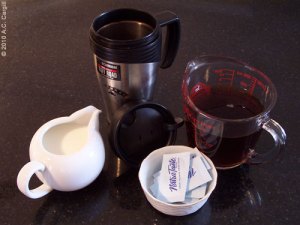 Every morning, hubby would fill my simple yet very useful Zojirushi travel mug with a freshly steeped and strong flavored black tea such as Borengajuli Estate or Scottish Breakfast, smoothed with a generous portion of milk and a packet of sweetener. I was able to sip from it during the drive, but mainly saved it for my morning at the office (the tea would stay quite hot in the mug). The tea would usually last until lunch time. Then, I would be on my own, but hubby had thought of that, too, making sure I had Typhoo tea bags with me so I could make a refill for my mug. The one compromise was that I had to use the artificial creamer available in the lunch room (generously supplied by the company). The taste was tolerable, but quickly forgotten once I got back home.