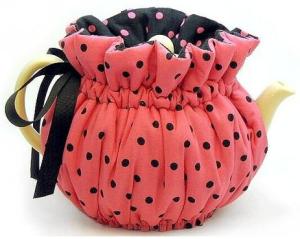 Some of the most unique designs I’ve seen include a crown-shaped cozy and a bamboo basket cozy with a special teapot sized to fit inside it perfectly. There is also one shaped like a cupcake that looked more like a thistle with its downy threads bursting out the top. “Critter” designs I’ve seen include one in the shape of a ginger cat, several in the shape of frogs (personally, not very appetizing), a couple of ladybug ones, a bumblebee, a poodle available in both white and baby blue, and cashmere elephants. Don’t forget the whimsical, such as a knit cozy with an elf sitting on the knitted flower-strewn top, another in the shape of a beehive complete with bees on the sides, or the cottage-shaped cozies that bring a smile as they keep your tea warm. Lots of antique tea cozies are out there, too, such as one design of a doll with a celluloid head and a full skirt over a wire frame. It was fairly large and really dominated the tea table.