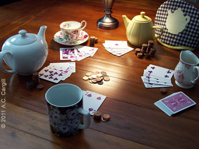 Our round dining table had been turned into a mini-Vegas scene, with various of our teawares, from teapots, mugs and cups to a cream pitcher in a circle. They were holding cards. They were talking and laughing. They had stacks of pennies in front of themselves and another pile in the table center. What they weren’t doing is their jobs of heating water, steeping tea, and serving it to us, their humans. Unconscionable!