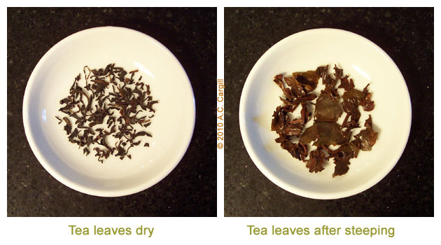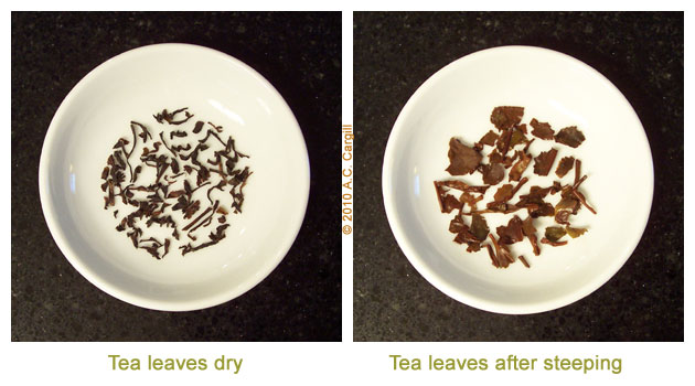 Czar Nicolas Russian Caravan — That smoky Lapsang Souchong flavored from those pine fires used to dry them and a malty Assam that was processed in a more orthodox manner tell of a long tradition of bringing these two very different teas together, one from China and one from India. Larger piece sizes than Breakfast Blend No. 2 above, in part because they start with larger leaves. Again, a reddish tint to the leaves after steeping.