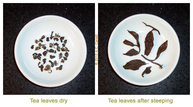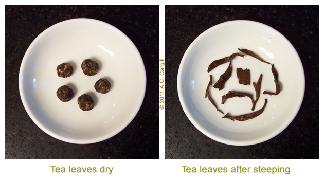 #1 Red Dragon Pearl — The dry tea comes in hand-rolled balls about the size of a chickpea (per the vendor’s site) and unfurls nicely during the steeping. The rolled up “pearls” tell of skilled fingers but don’t show you what the leaves are like. After steeping, however, you can see the tender two leaves and a bud combo, which tells of skillful plucking of those leaves from their mother tea bush.