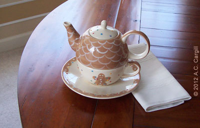 Tea-for-one sets are wonderful mood setters for special tea moments all to yourself to enjoy a cuppa your favorite tea. This gingerbread set is no exception. I’m not sure how well it would steep and serve up tea were the cup, saucer, or teapot have a bite or two out of them. Of course, it depends on where and how big the bites are.