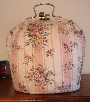 On to popover cozies, starting with various types of traveling tea cozies, where you put the teapot into a container that closes up so you can take it with you. In the old Mr. Wong films with Boris Karloff, his servant always brought tea in a covered wicker basket cozy with a handle. The basket had built-in compartments for teapot and cups. These types of cozies can be found on occasion in antique shops or on eBay. Tea pluckers carry their tea into the fields in a fitted basket too, although of a somewhat different design than Mr. Wong’s. These feature a lid fashioned in the shape of the sunhats worn by the pluckers.