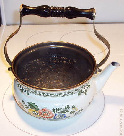 Do avoid watching the tea kettle as it absorbs heat and transfers that heat to the water within. The old saying “A watched pot never boils” has nothing to do with science. It has to do with the bashful nature of tea kettles of all types. If you stare at it, it becomes very self-conscious and, just like we humans can do under such circumstances, tends to fumble at whatever it is doing.