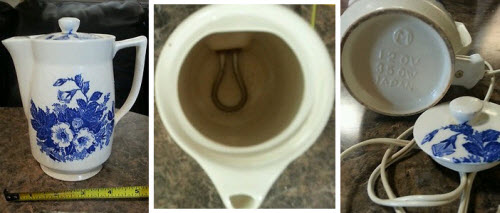 - Electric teapot — White ceramic with hand painted blue flower design. Owner states: “Works great element gets very hot and fast. Electric cord is included.” Personally, I would refrain from using it to steep tea. It’s just too rare to risk it.