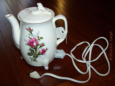 You read that right: electric teapots. Sure there are tons of electric kettles, but electric teapots are a little less well-known. Apparently, they were the rage at one time but are now found on ebay.com and in consignment shops — which is where I found mine just recently. I named him “Ed.”