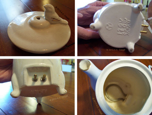Clockwise from top left: lid with bird and that little hole that whistles, bottom showing voltage, the inside showing the heating element, and the prongs to connect the electrical cord: