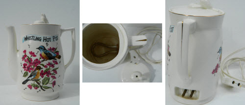 - Vintage Ceramic Electric Whistling Hot Pot with Floral and Bird design and ceramic bird topper — Also from the 1960s and ceramic, made in Japan. It is 7” tall and 6” wide. The front of the pot shows 2 birds on a pink flowering branch, and the back has one bird. The heating element is inside and attaches to a removable electric cord. The lid has a small hole that is supposed to emit a whistle when the water reaches a boil.