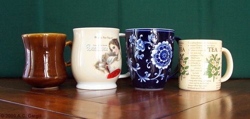From left to right below: a typical thick-sided diner coffee cup (the sides curve inward, reducing the capacity of the cup), a round-bottomed cup with a slightly flaired rim, a narrow-bottomed cup with a wider rim, and a straight-sided cup. The best for that cup of tea you sip from while eating lunch is the second from the left, in my opinion. However, that coffee cup is good, too, since it keeps the tea pretty warm with its thick sides.
