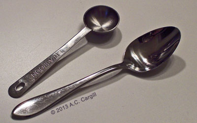 Note that when a tea vendor says “teaspoon,” they are talking about the measuring spoon kind, not the table kind. As you can see below, there is quite a volume difference: