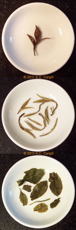 One thing you will note is that the colors of the tea leaves shown here are rather Autumn-like in their hues. The top one is a tippy black tea with coppery color to the leaves. The middle is Dragon Pearls Green Tea showing those “pearls” fully opened after two or three infusions and sporting a bright yellowish green hue. The bottom one is Spring Pouchong Tea, a lightly oxidized oolong (although some consider it a green tea) with a mix of those small tip leaves and larger ones from further down the stem (but not too far) and displaying a bright green (kind of like a tree that is resisting the call of that time of change).