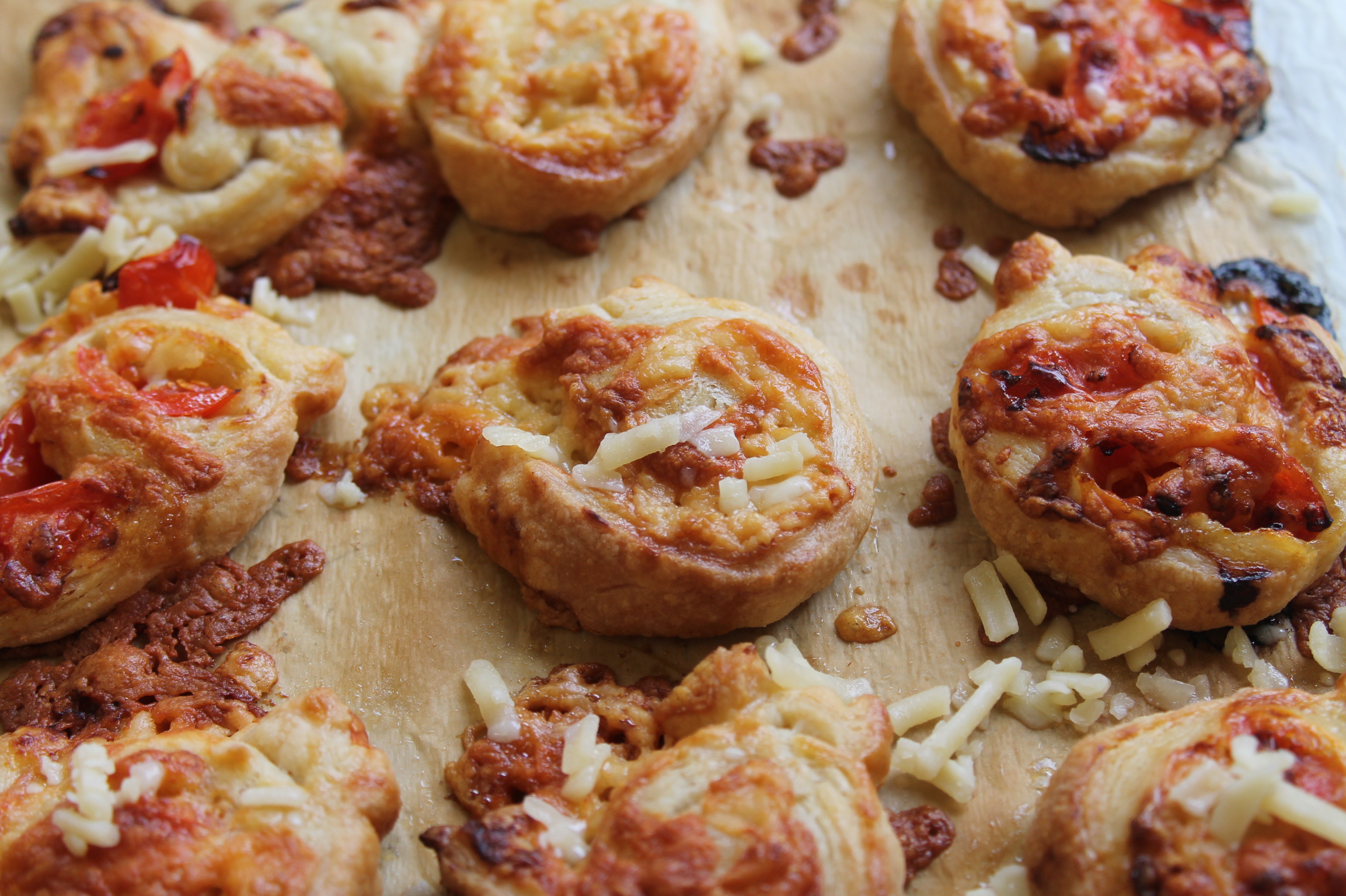 Roll out your pastry quite thinly into an oblong about 18 inches by 14 inches. With the short sides to top and bottom, spread the pastry with softened butter. Put slices of fresh tomatoes or halves of cherry tomatoes on top of the butter, I used ten cherry tomatoes cut in half. Thinly slice some strong Cheddar cheese and lay on top of the tomatoes. Leave a one inch gap in the middle of your pastry and brush this with beaten egg, then roll down from the top to the gap and up from the bottom to the gap until they almost meet. Wrap in cling film and pop into the freezer for about half an hour. After 30 mins remove from freezer and place the roll onto a floured worktop. Cut through the centre strip to separate and slice the roll into approx half an inch slices and put onto a lined baking sheet and brush with beaten egg. Cook for about 10-15 mins until golden brown. Sprinkle with more grated cheese when they are cooked and leave to cool. They are good served immediately warm from the oven or cold the next day. If you want you can freeze one half and cook it another day. Depending on the thickness you can make about 20 – 30 whirls with these quantities.