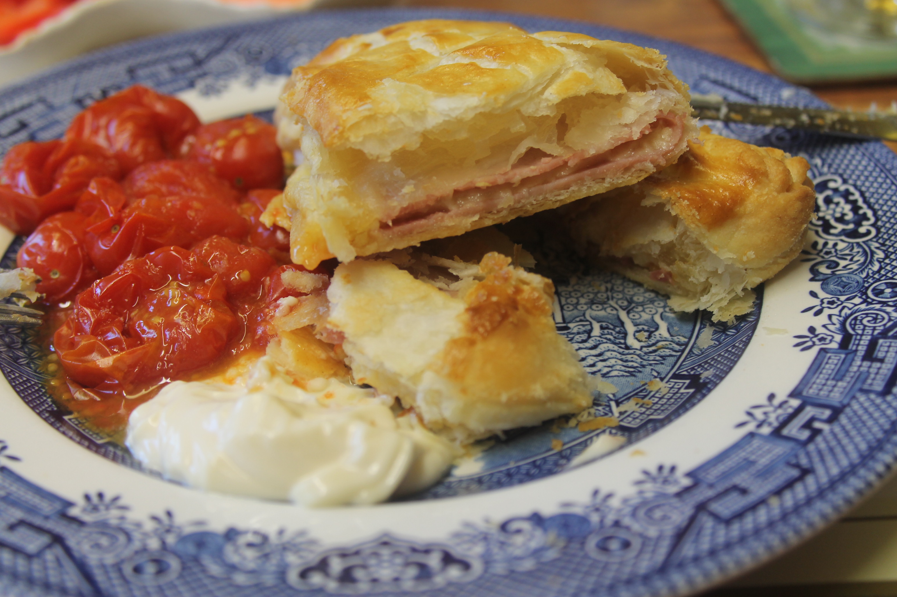 you can buy the ready-made puff pastry, you will also need some nice cooked ham and some very strong cheese. We have made cheese pasties before and they are similar but the ham just adds that little bit extra taste and also they can be used as a main course if you make them big enough.
