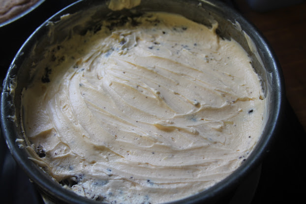 Make the base by combining all but three of the crushed biscuits with the softened butter and press 2/3 of this mixture into a 8″ spring form tin and leave to cool.