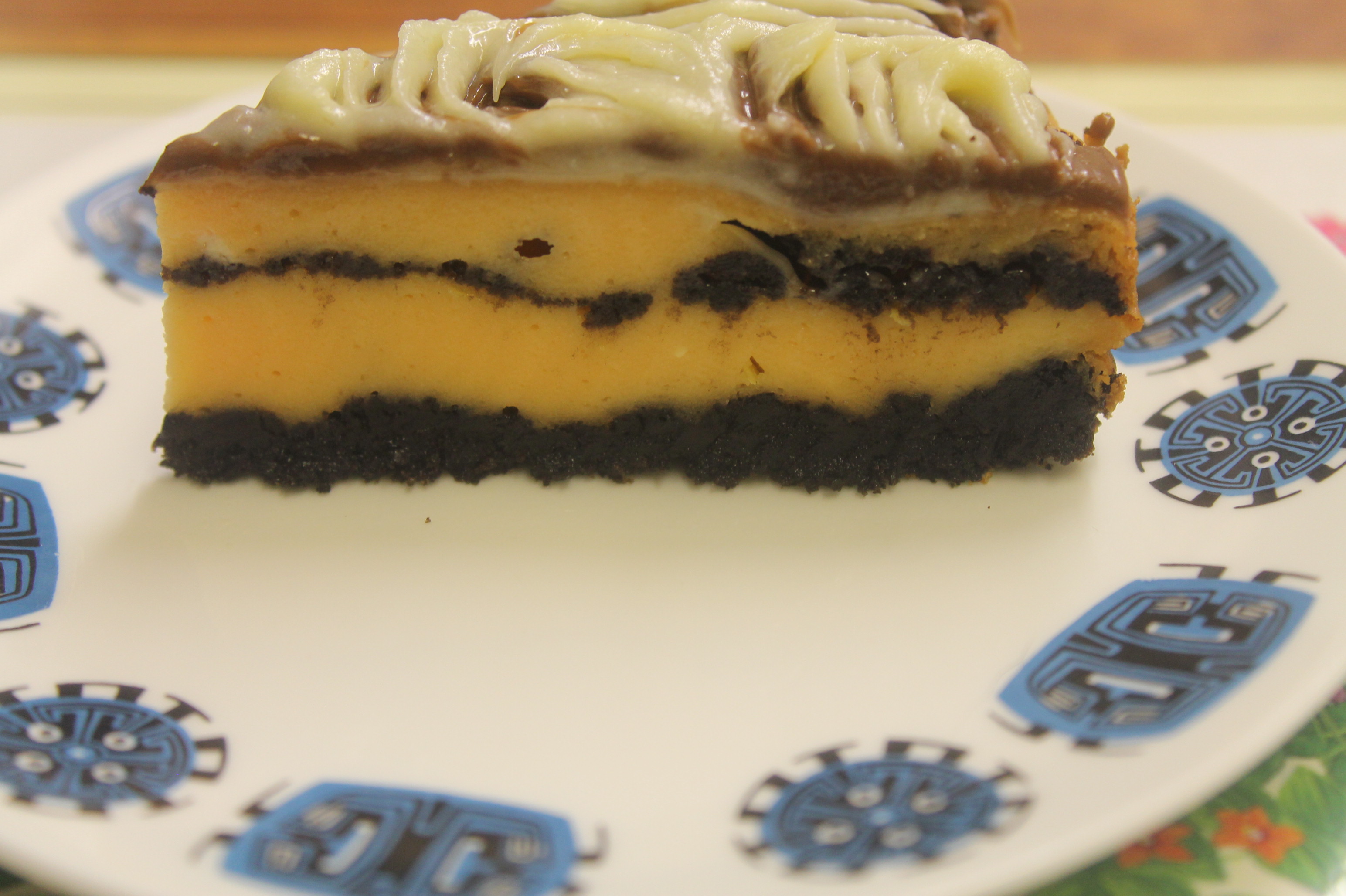 For the topping melt the dark chocolate and mix with 3 oz cream, melt the white chocolate in a separate container and mix with the remaining one oz of cream. Spread the dark chocolate over the entire cake top and drizzle on the white chocolate. Use a fork to create a pattern on top and, presuming you still have the 3 biscuits you did not use in the base then use these to decorate the sides. Mine had mysteriously disappeared when it came to this part!!