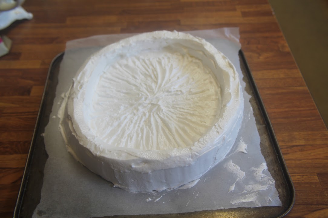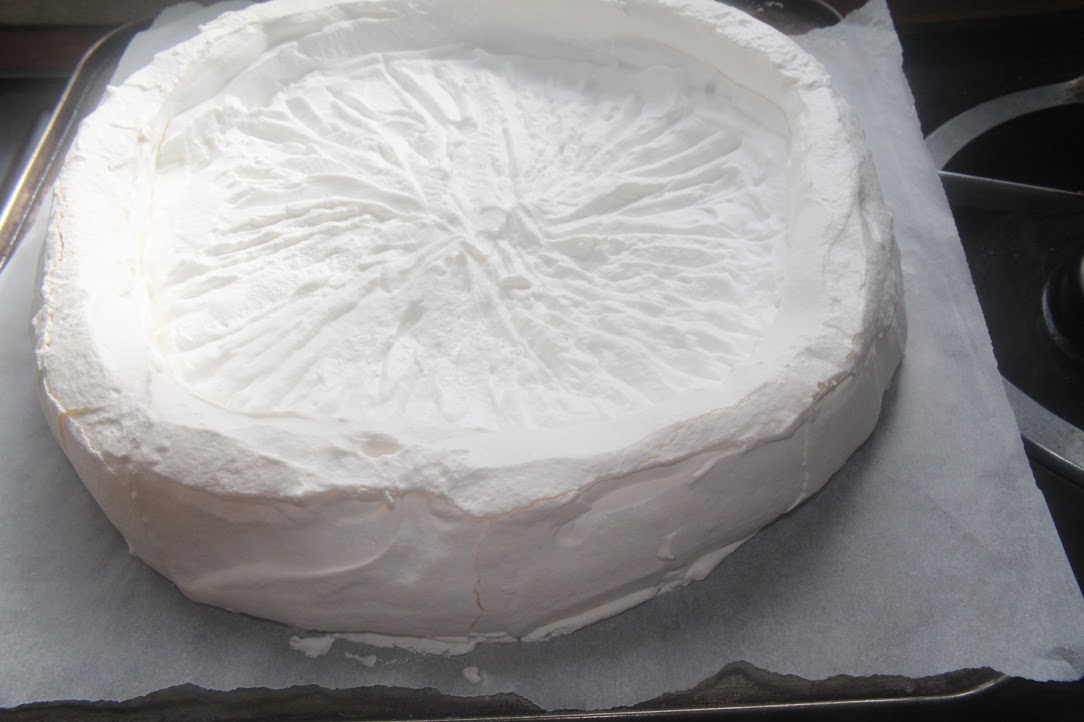 On a lined baking sheet mark a circle with a pencil round a dinner plate and either pipe your meringue round the circle to the middle and up the sides slightly or us two metal spoons to make a shallow dish like shape.