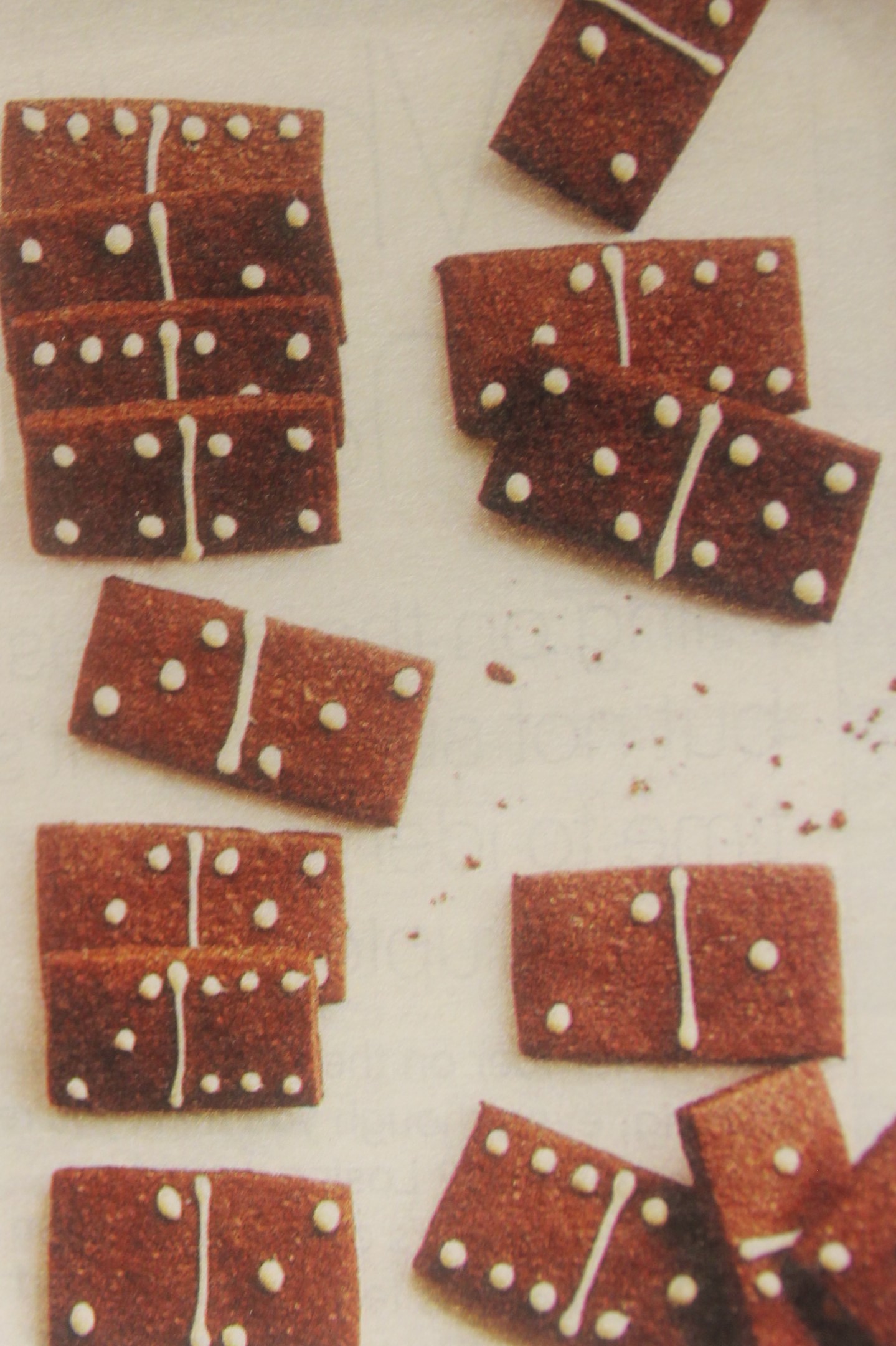 Leave to cool on the sheets and then transfer to a wire rack. Use either the icing or the melted white chocolate and pipe lines and spots on the biscuits to look like domino’s. They will keep in an air-tight tin for a week unless they are all eaten on the same day! – JAB