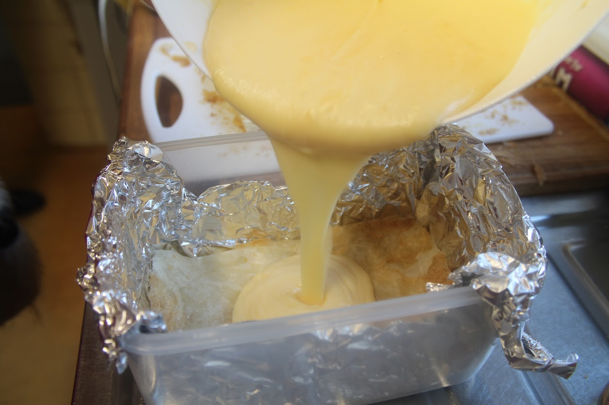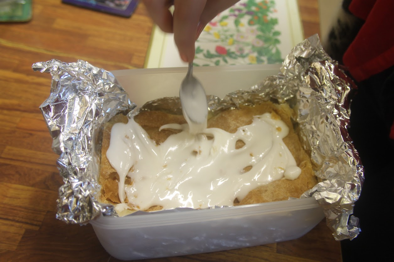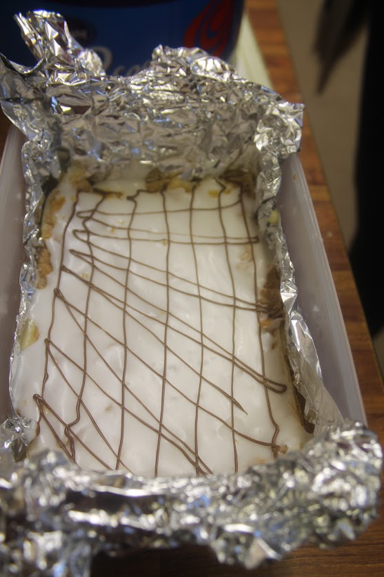 Take the custard slice from the fridge and spread the icing over the top layer of pastry. Using the chocolate in the piping bag draw parallel lines along the top of the icing in one direction and then some lines in another direction to make a pattern. Put the tray into the fridge to set. When set remove the whole thing from the tray using the tinfoil and cut into eight pieces.