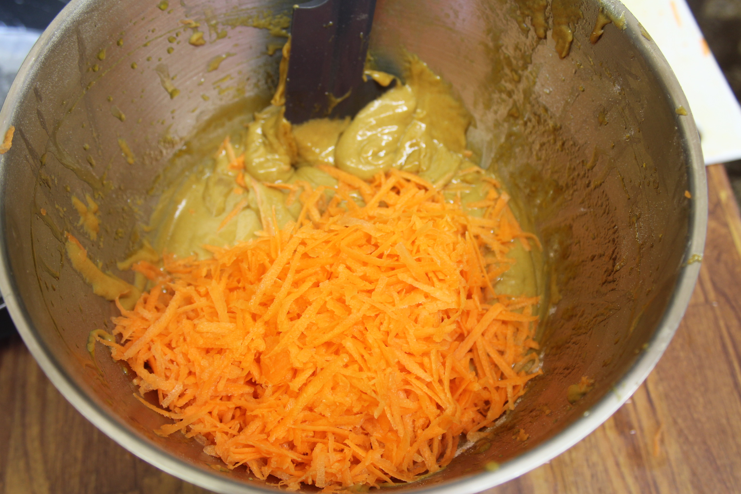 Whisk the sugar and oil together and then add the eggs one at a time, fold in the flour and spices and finally add the grated carrot