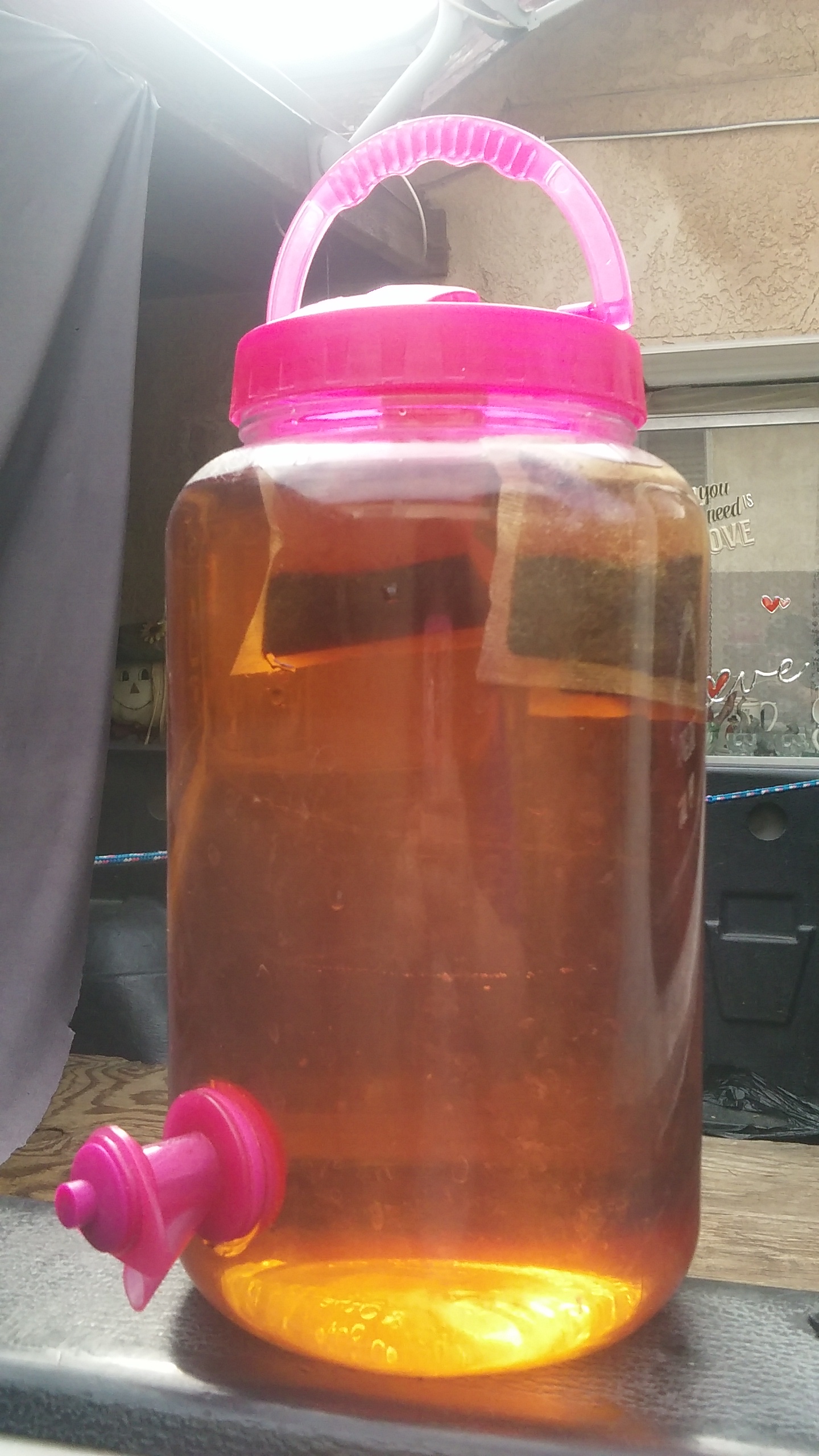 All you need is about 3-5 teabags of your favorite tea (the most common used is Lipton but I used Yorkshire) or more, depending on how strong you like your tea, distilled or filtered water, and a large clear container with a lid.